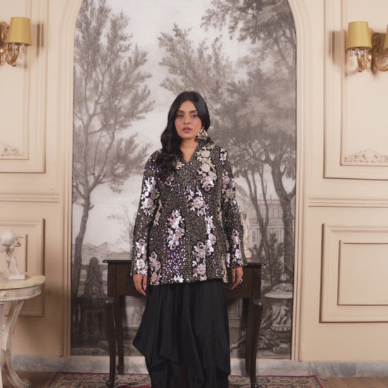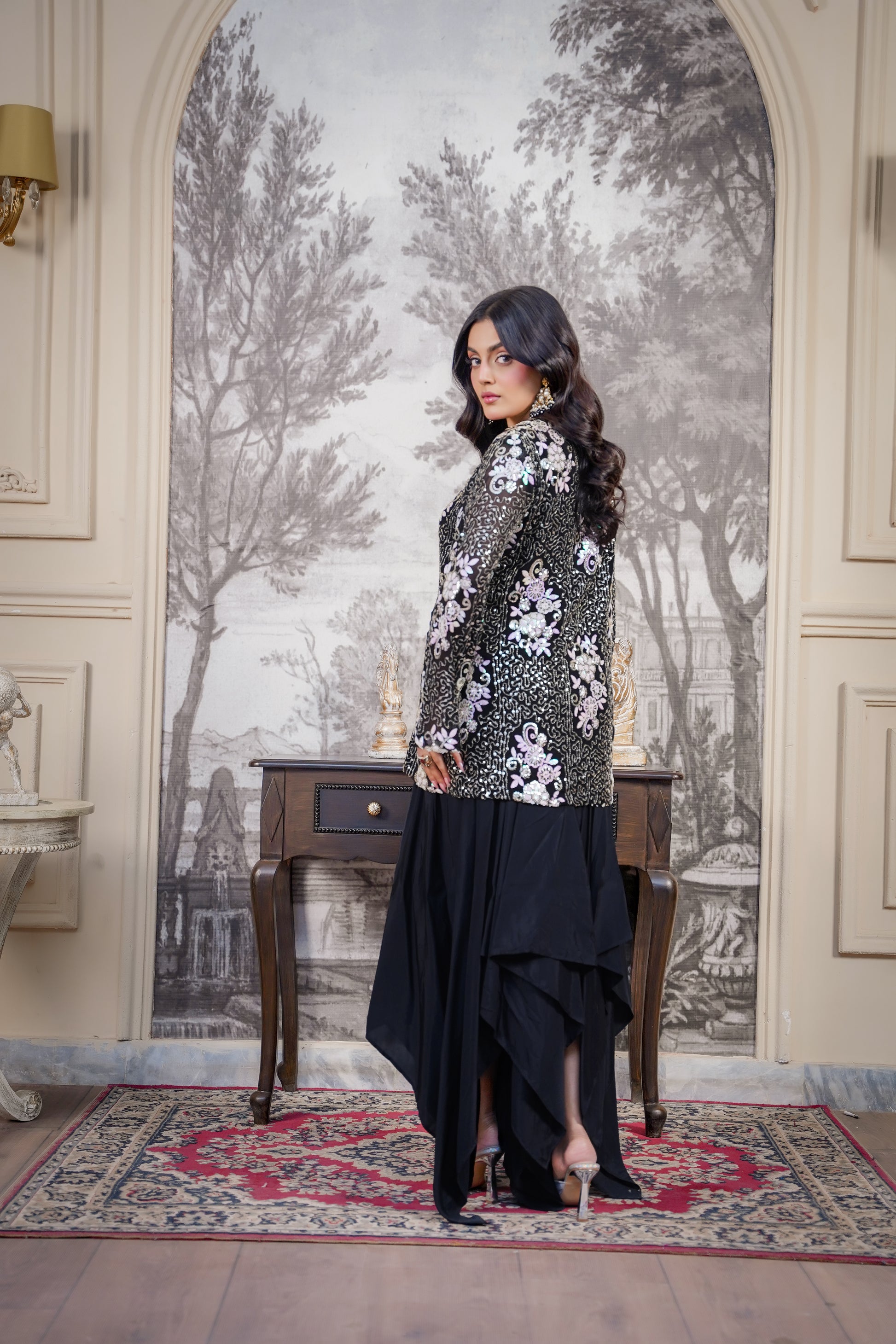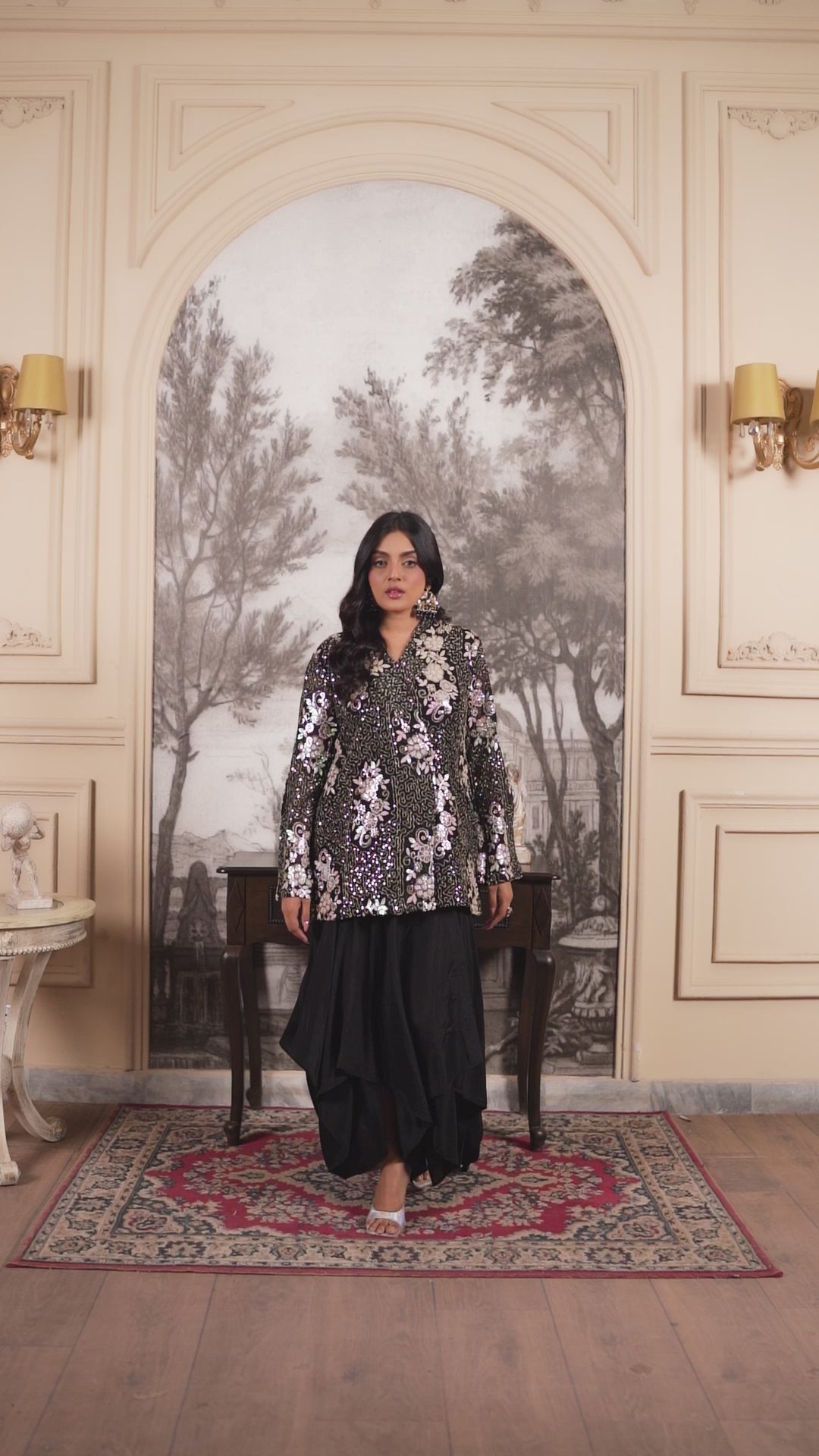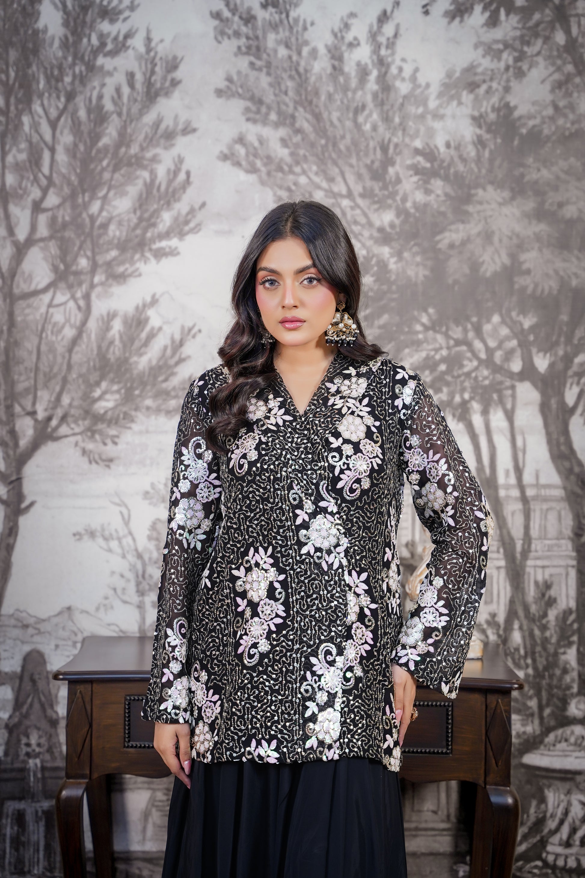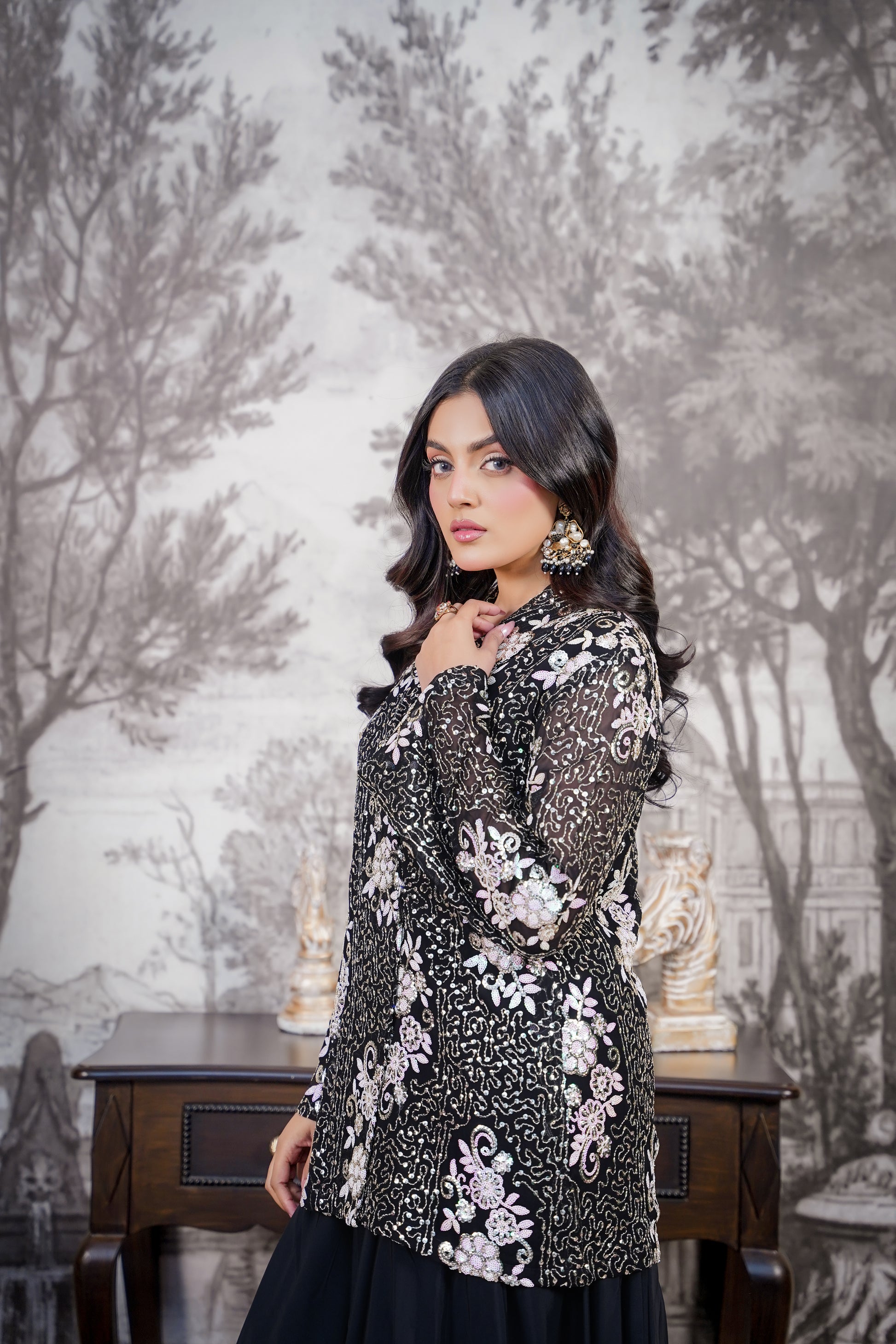 | Shirt | Fully Sequine Chiffon black Embroidered Front Back sleeves coat attache ineer | |||