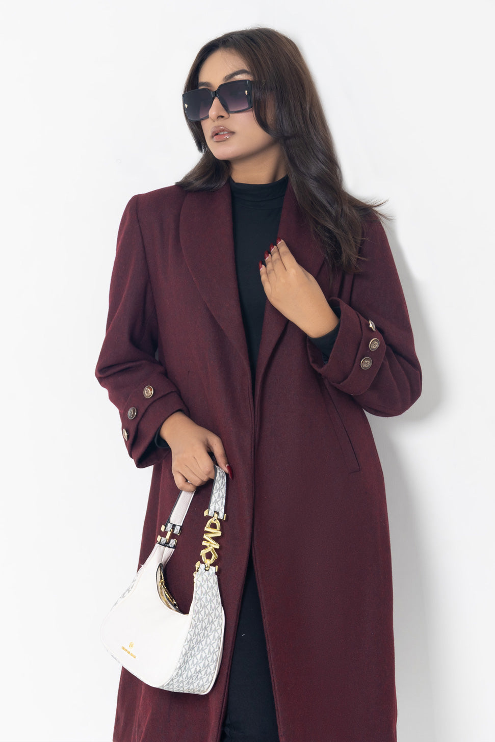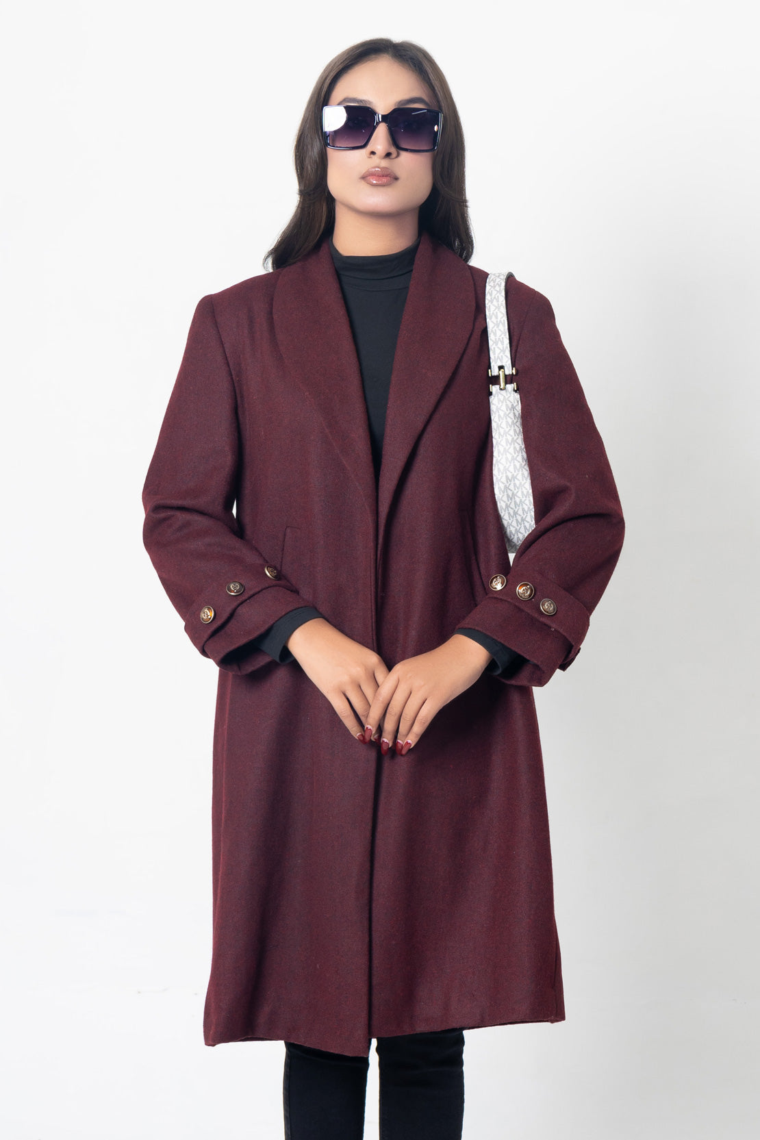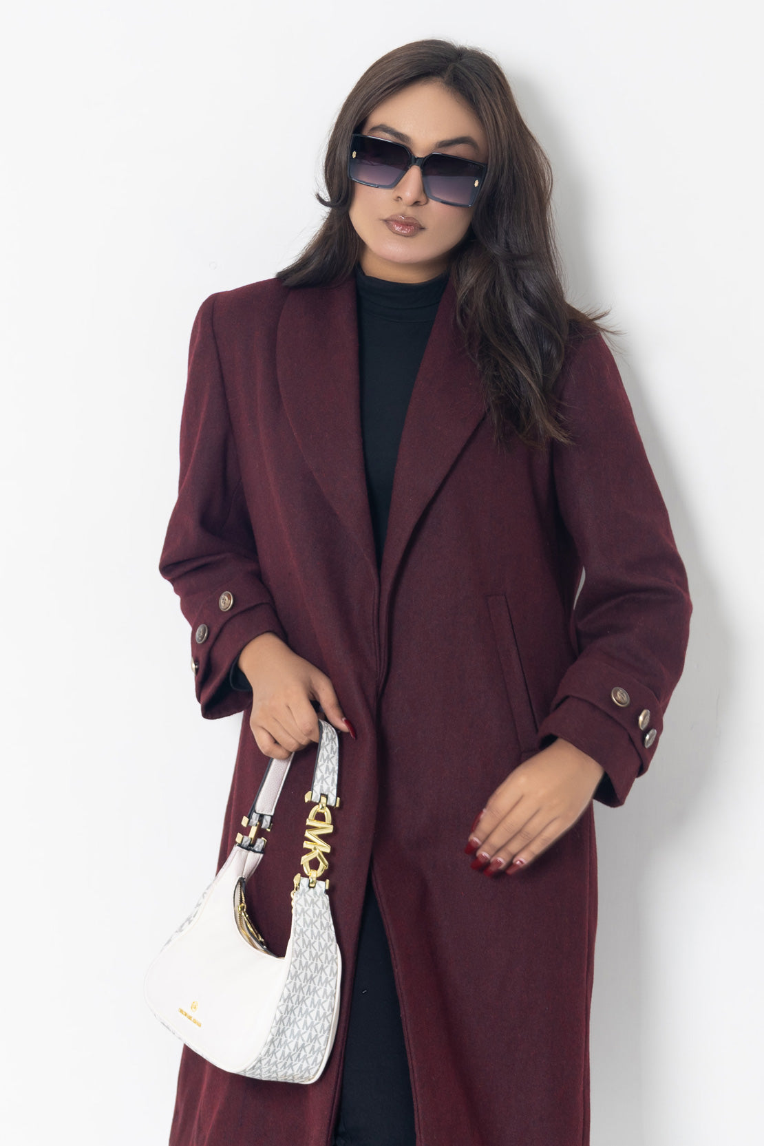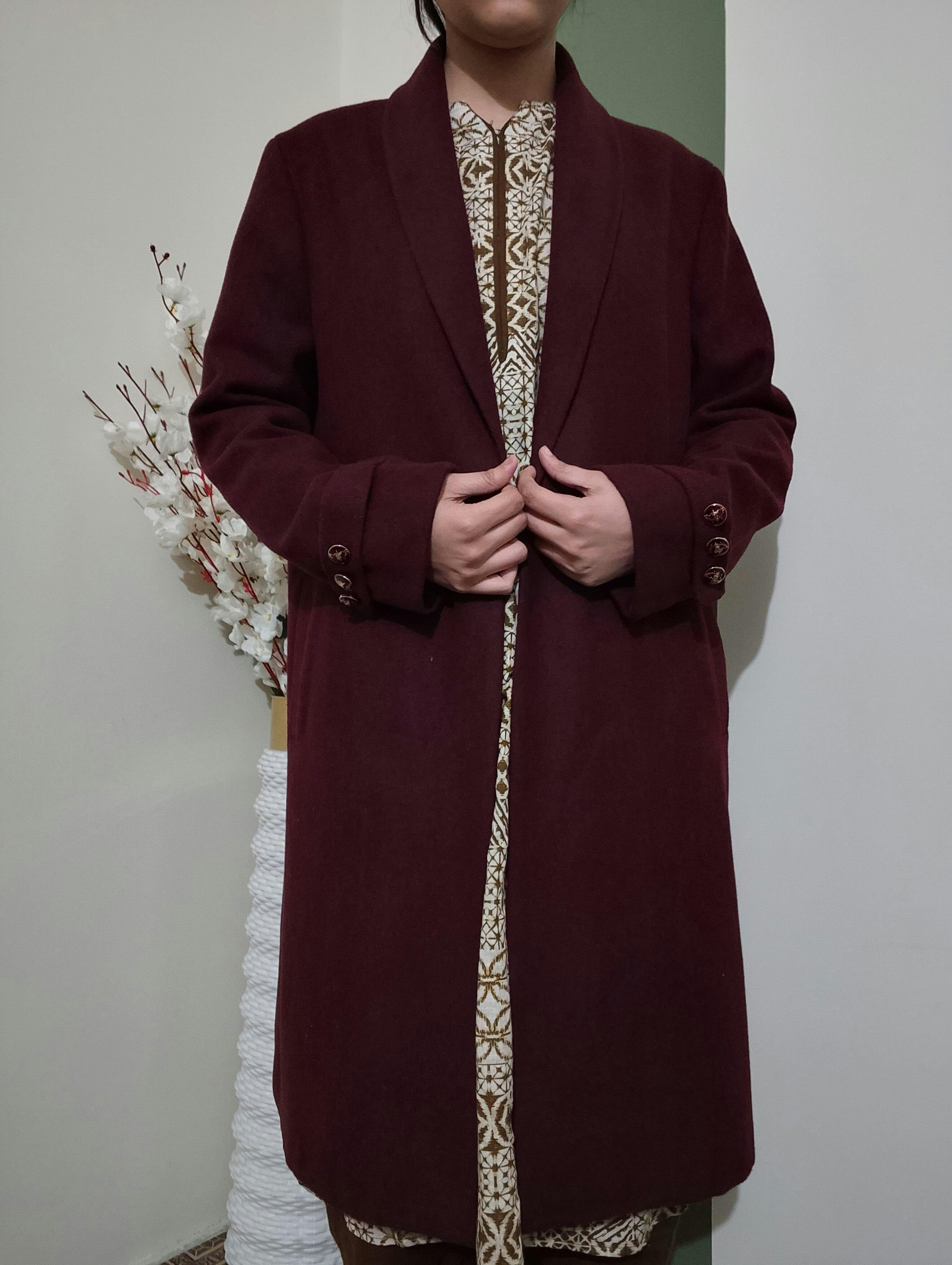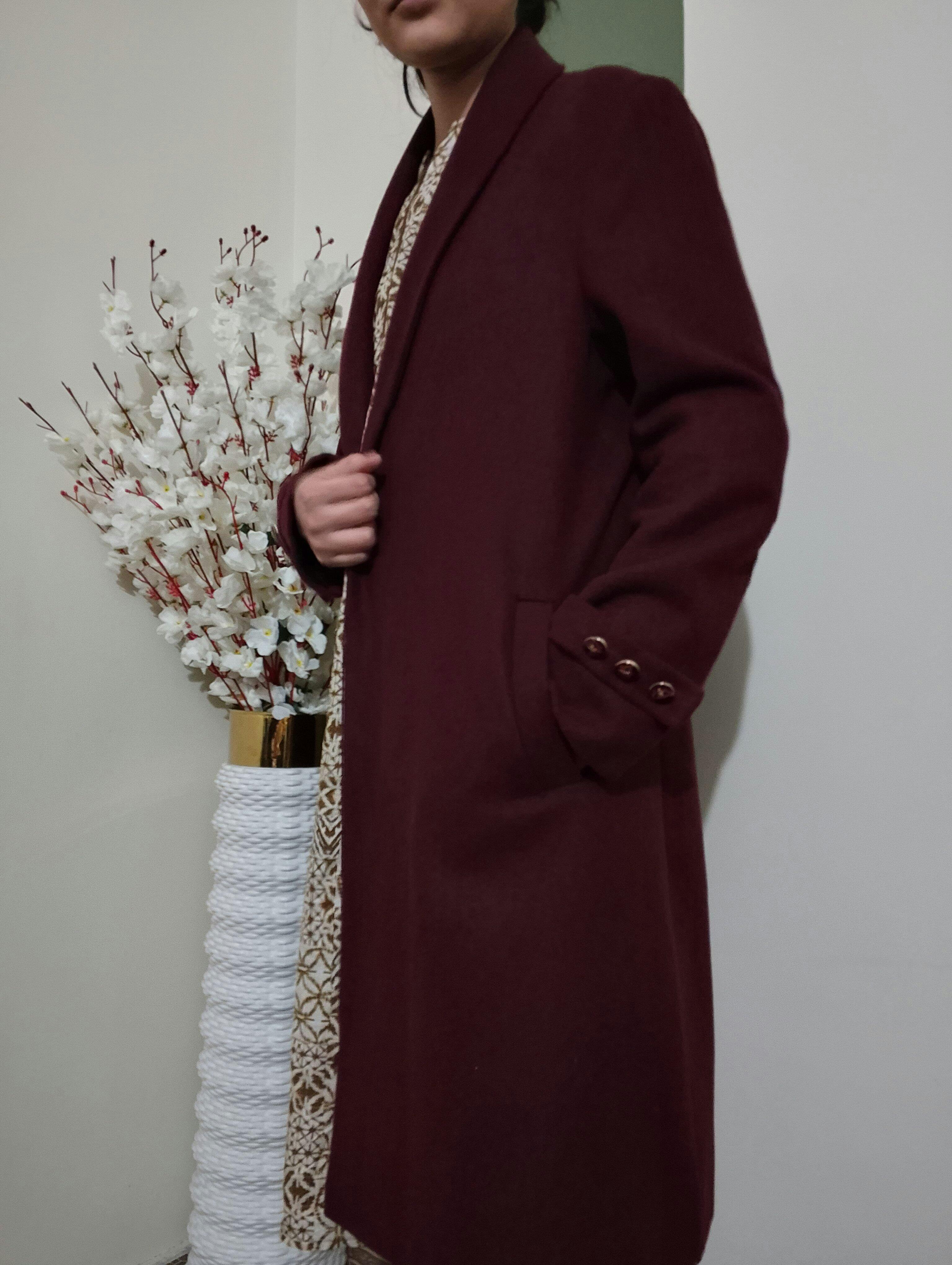 This maroon wool long coat is made from fine soft woolen fabric, providing both warmth and style. With full sleeves and a sleek design, it is perfect for any occasion. Expertly crafted for comfort and durability, this article is a must-have for any fashion-forward individual.