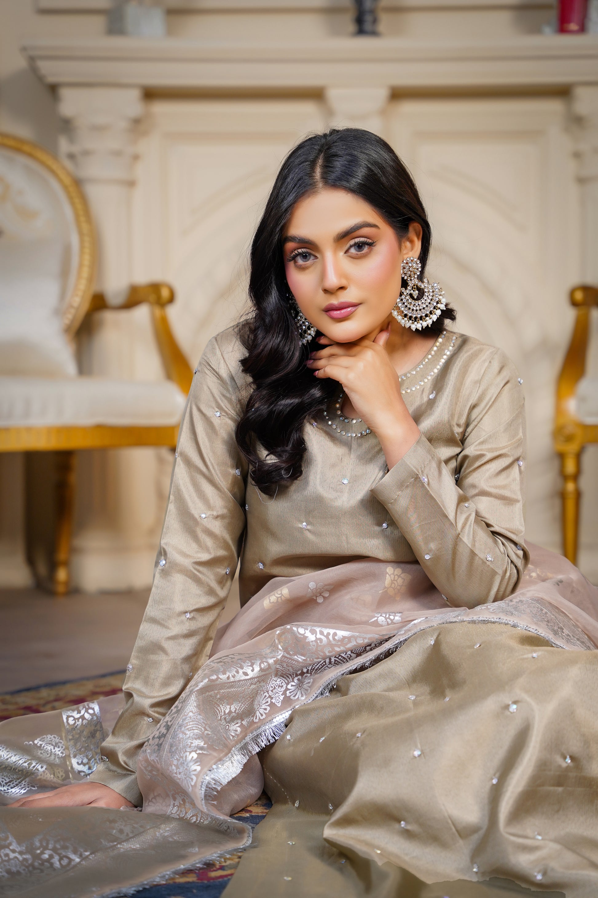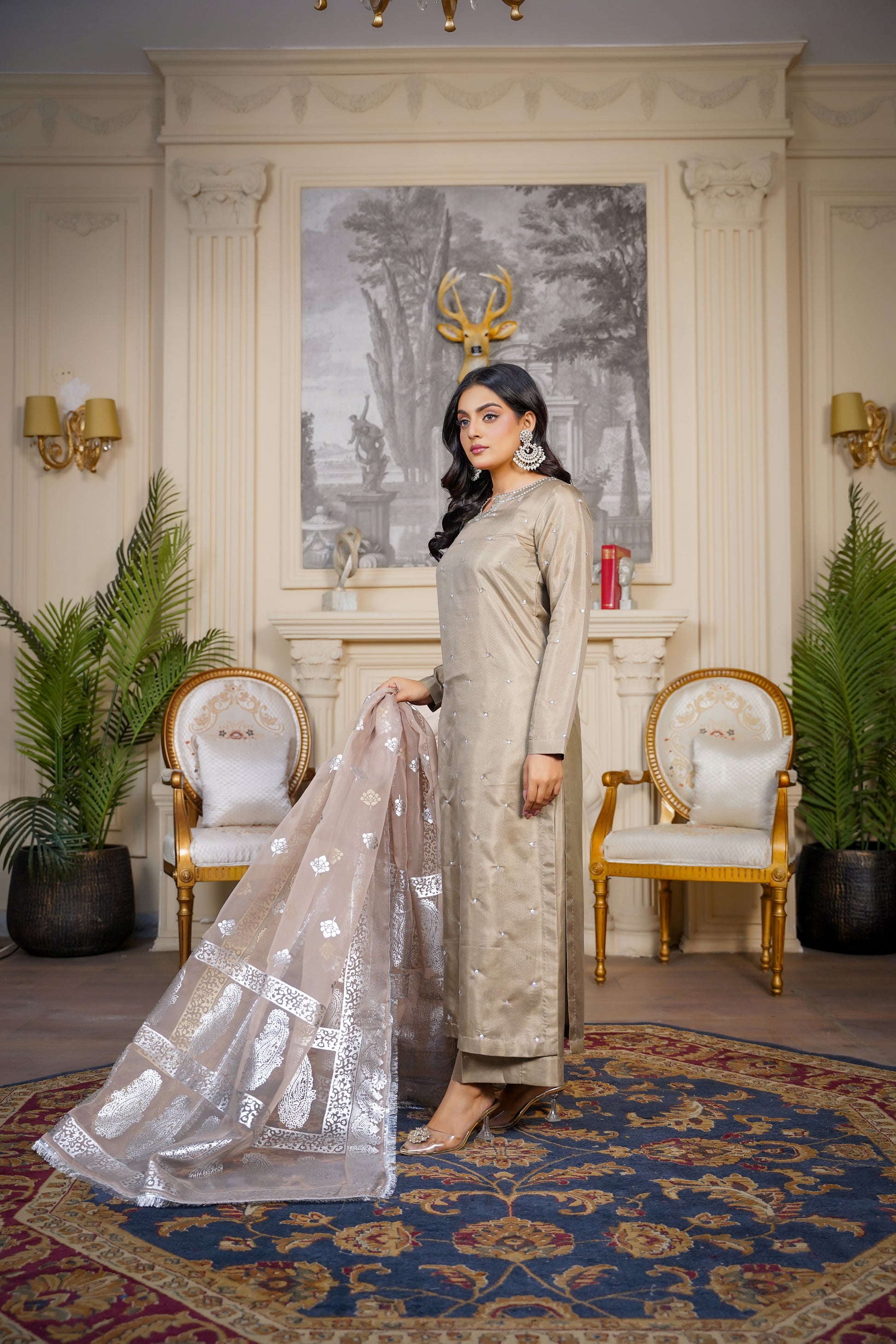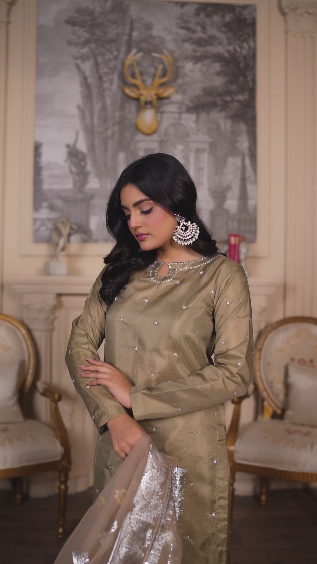 Elegant silk sikn outfit featuring intricate front stone work that adds refined sparkle and luxury. The smooth silk sikn fabric drapes beautifully, offering comfort and a graceful fall. Paired with a matching dupatta highlighted with delicate foil print, the ensemble reflects traditional charm with a modern touch, making it perfect for festive occasions, weddings, and evening celebrations. Ideal choice for women who appreciate timeless style and fine craftsmanship details today.