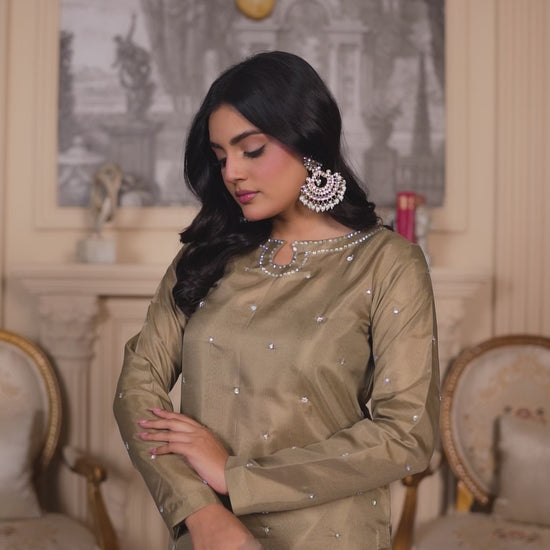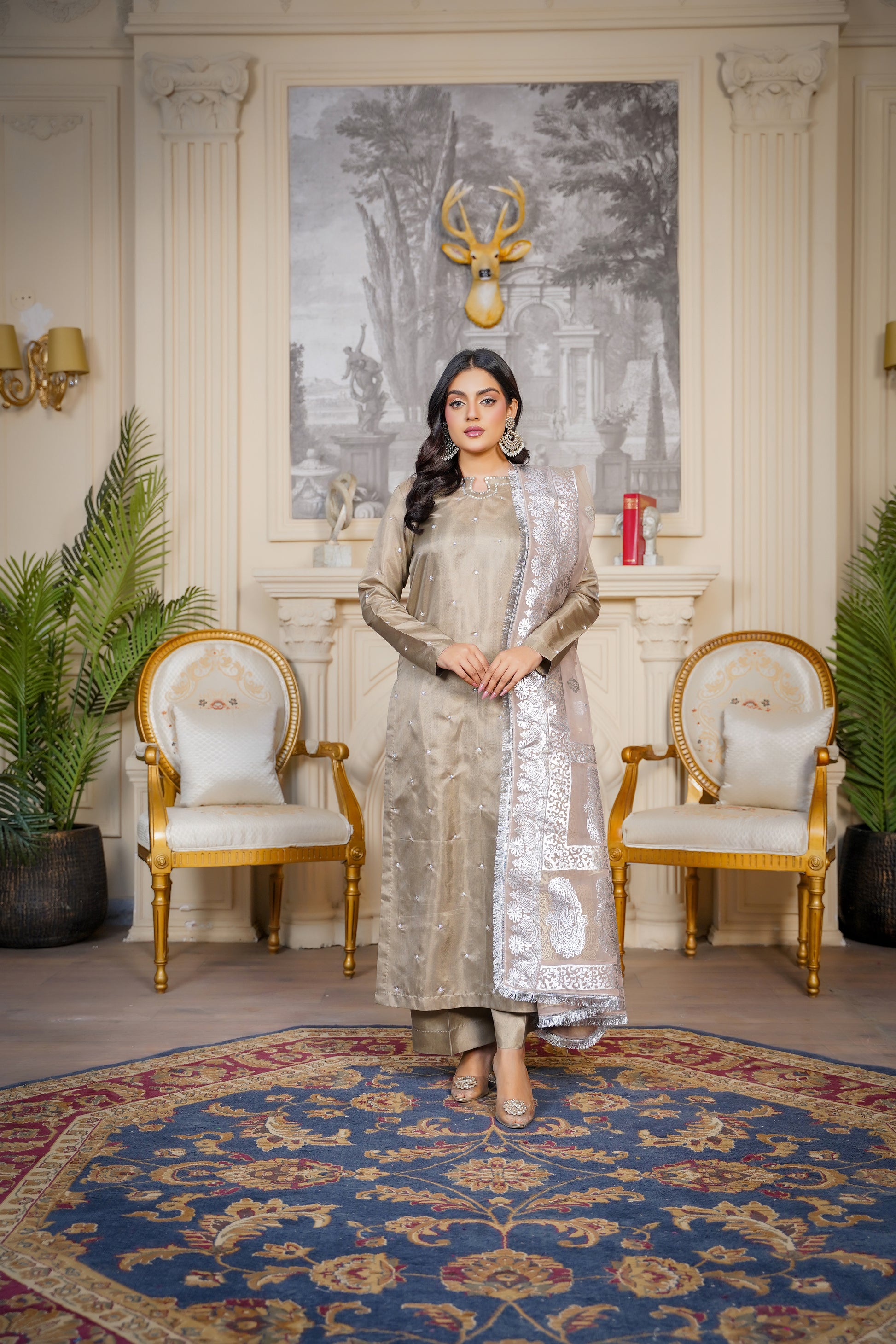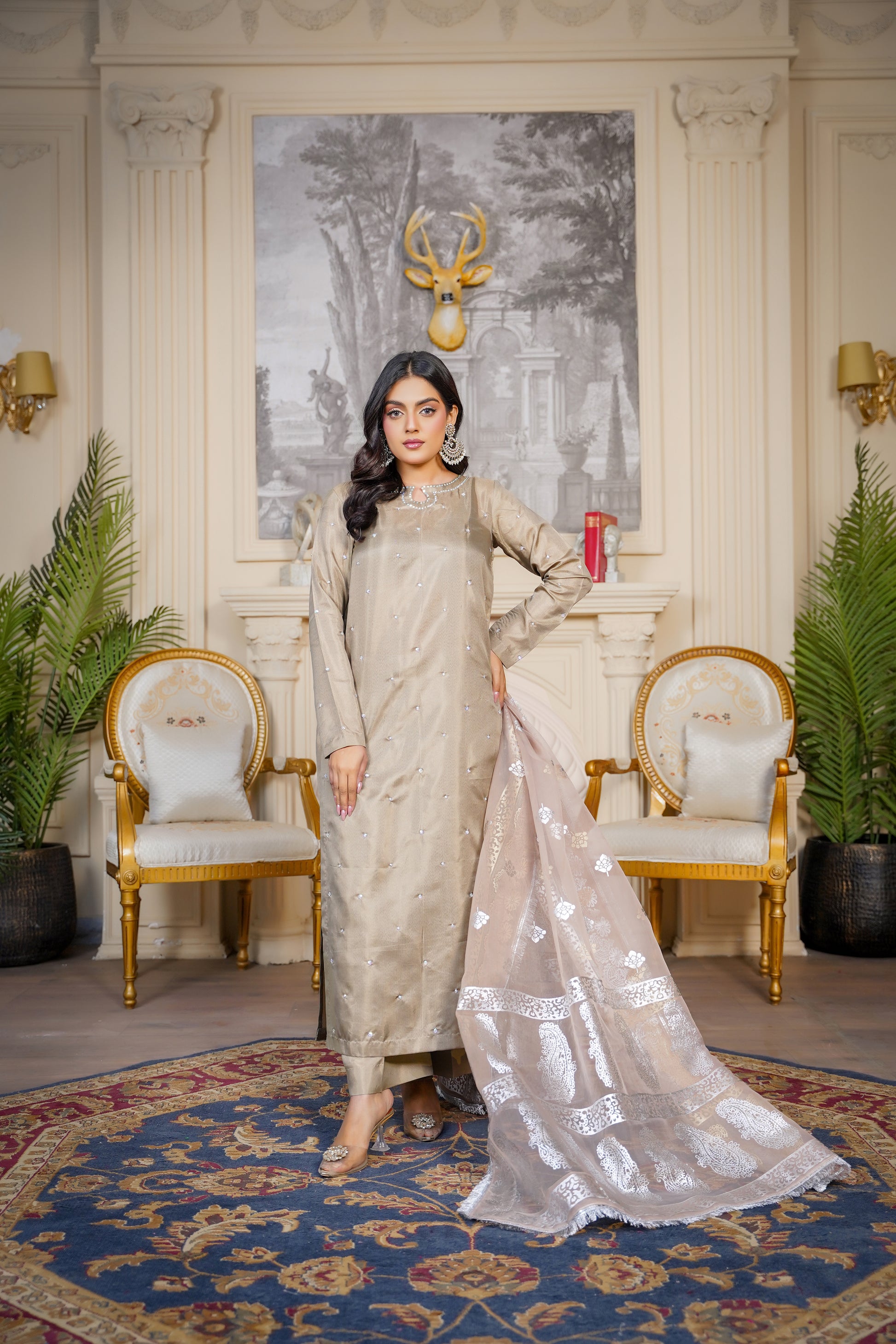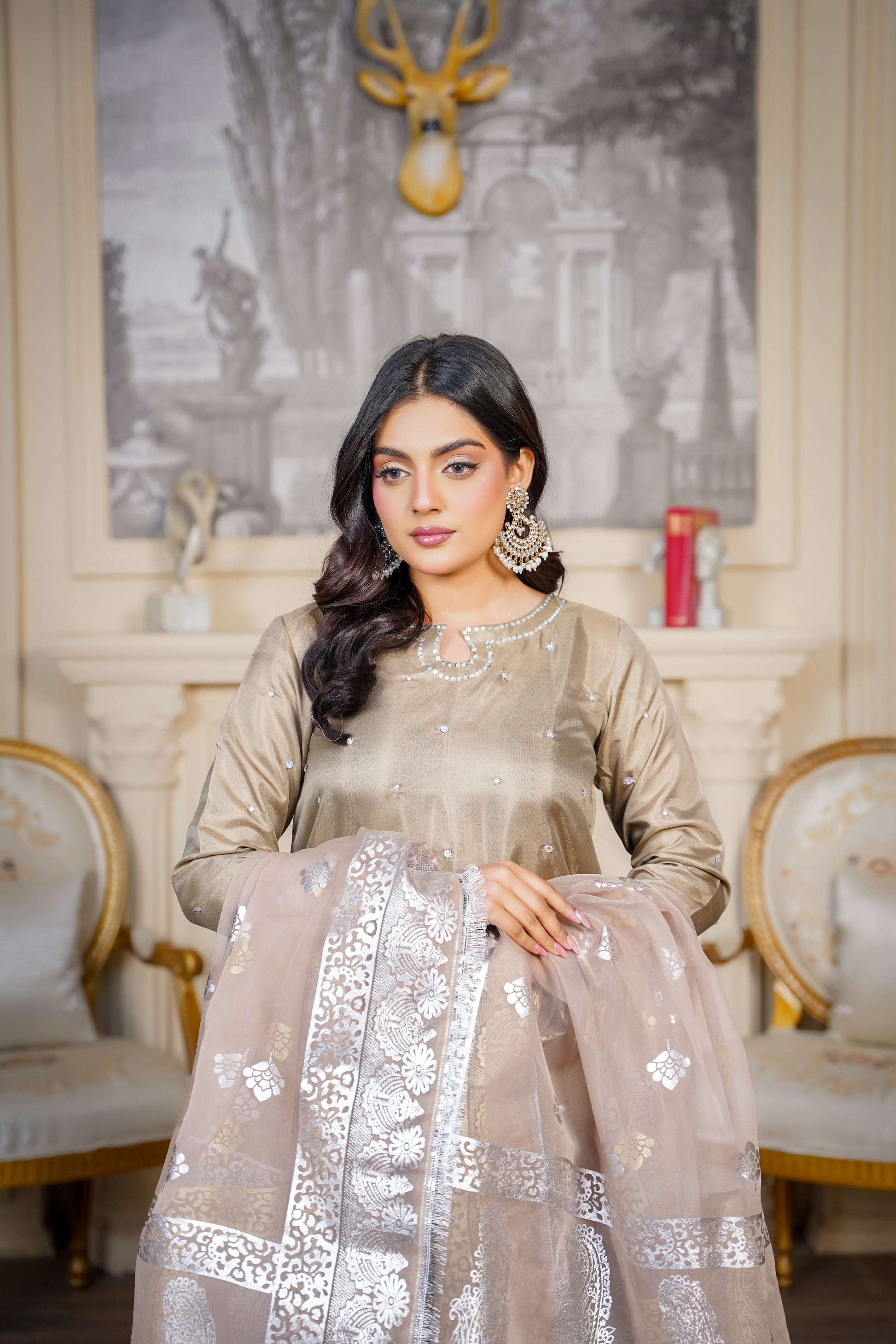 Elegant silk sikn outfit featuring intricate front stone work that adds refined sparkle and luxury. The smooth silk sikn fabric drapes beautifully, offering comfort and a graceful fall. Paired with a matching dupatta highlighted with delicate foil print, the ensemble reflects traditional charm with a modern touch, making it perfect for festive occasions, weddings, and evening celebrations. Ideal choice for women who appreciate timeless style and fine craftsmanship details today.