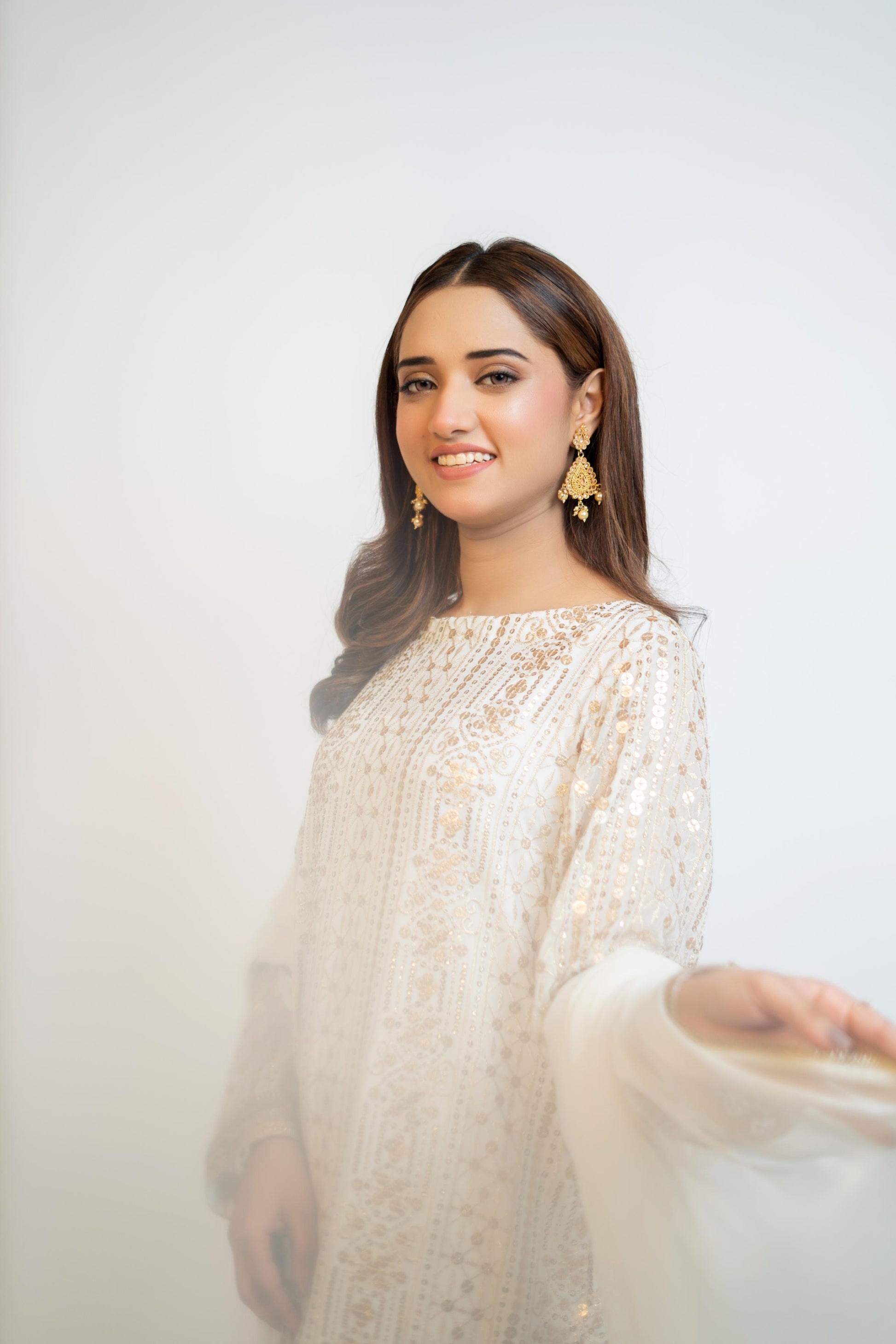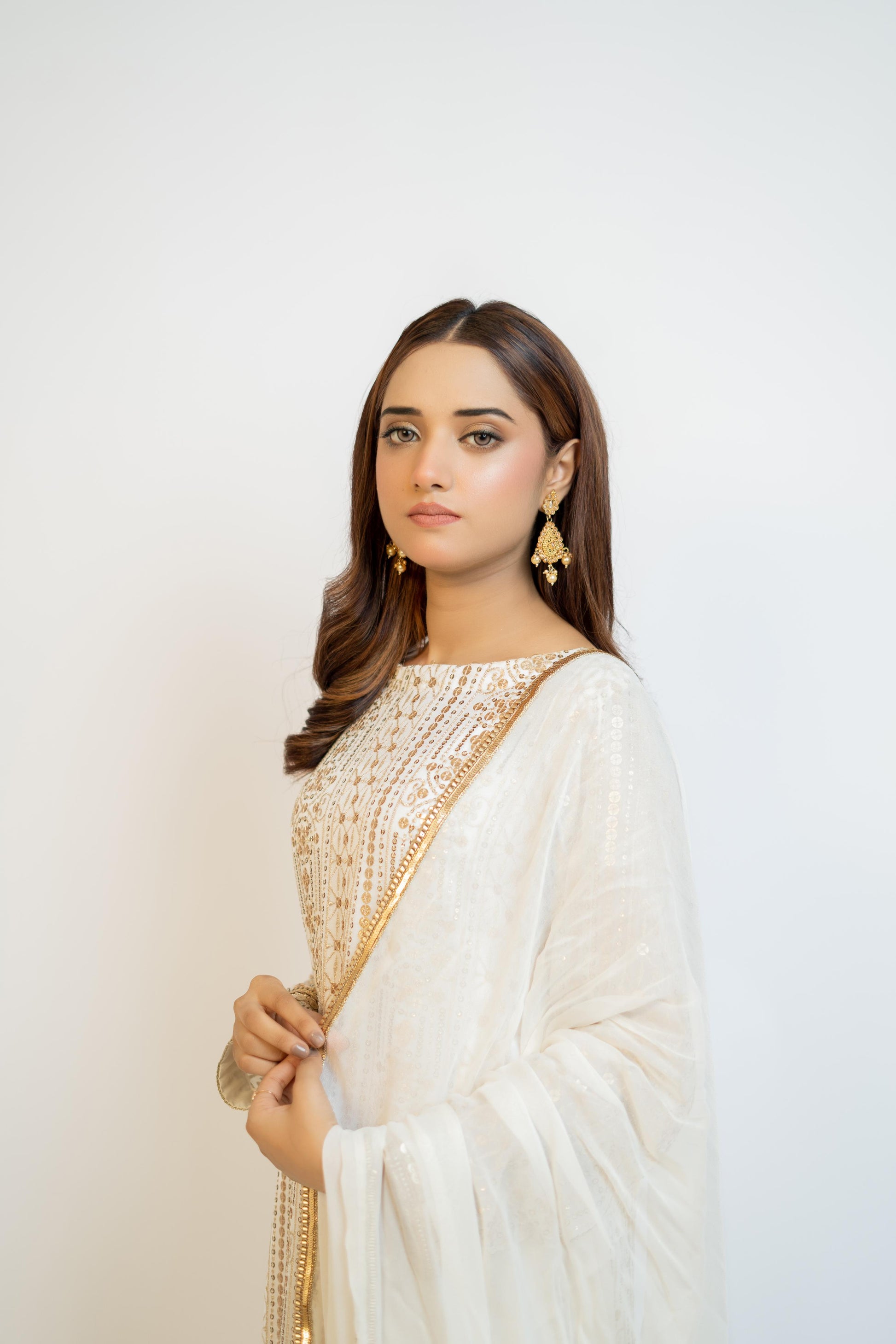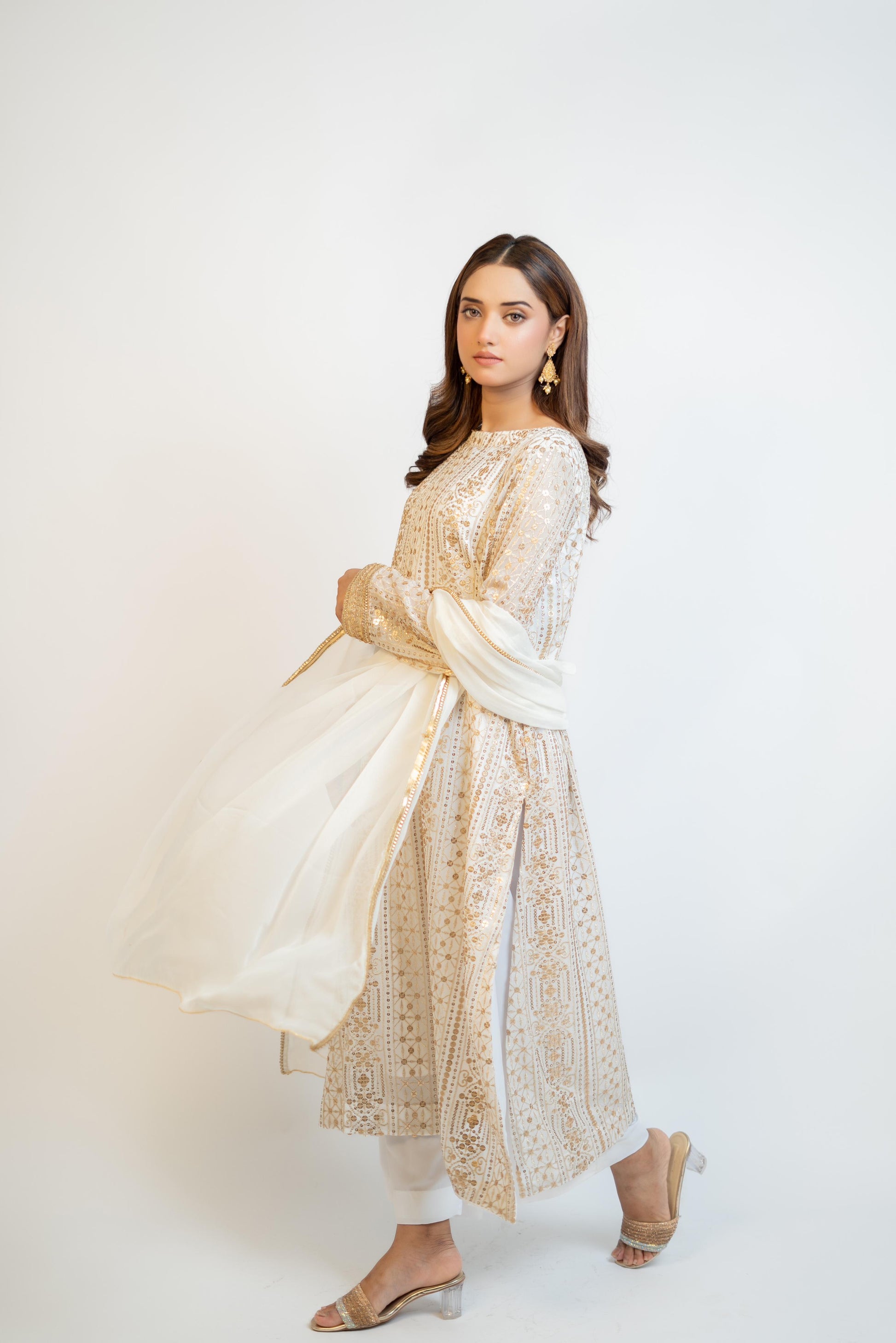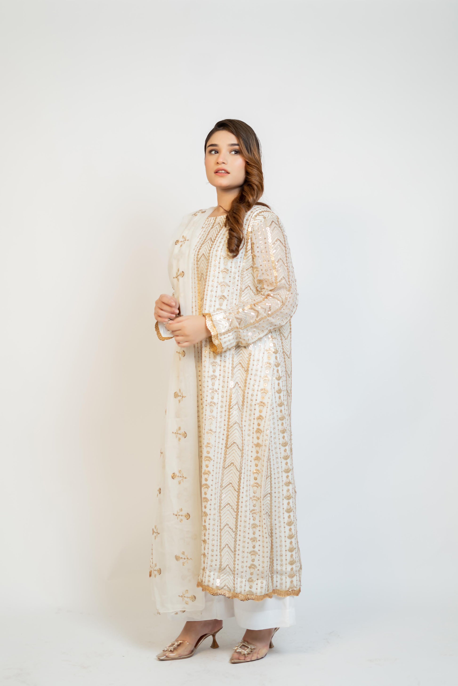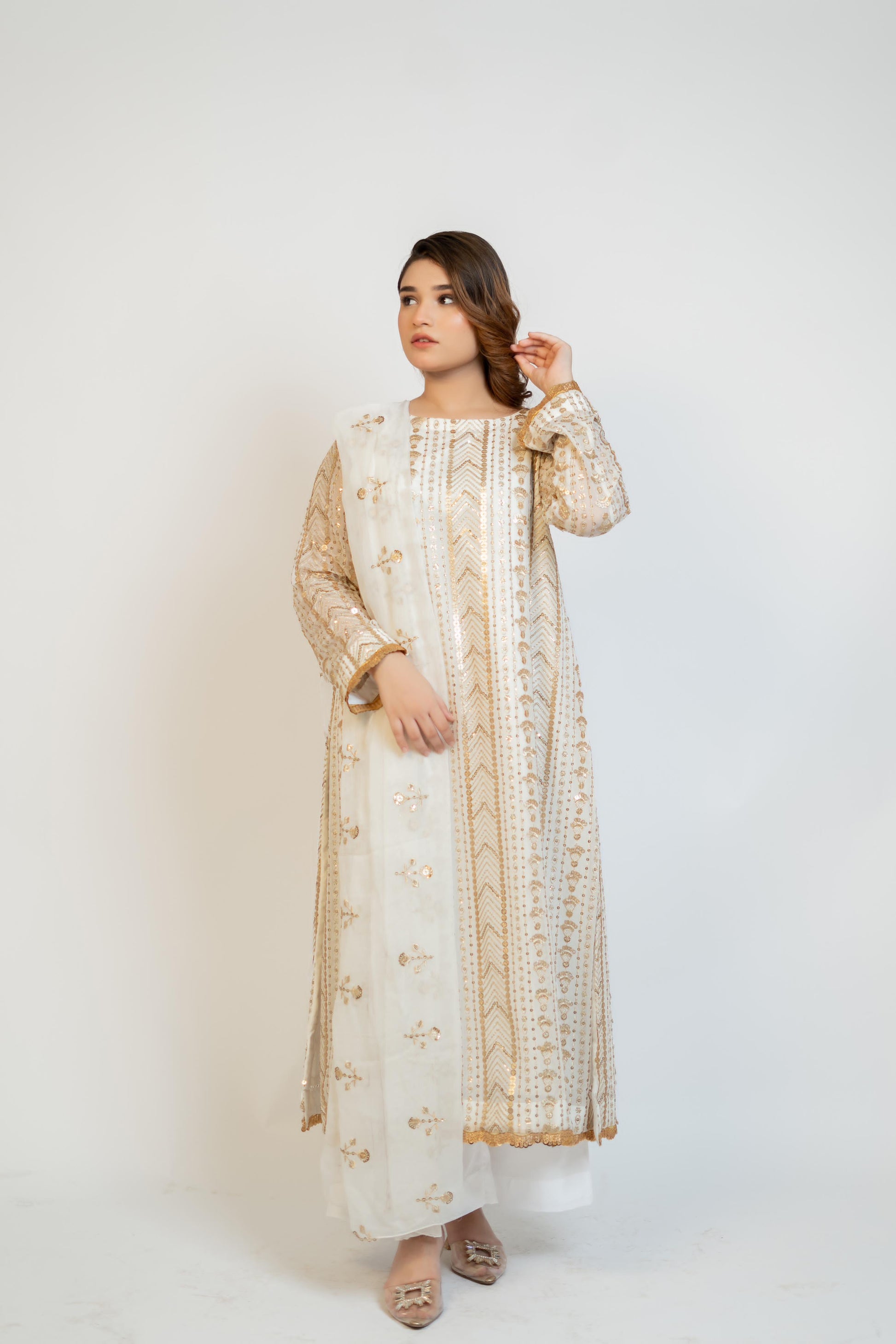 MH 01 is a stunning garment made with high-quality, fully sequined chiffon fabric. The pure white color is beautifully enhanced with embroidered front, back, and sleeve details. The use of crape silk and chiffon adds a touch of elegance to this versatile piece.