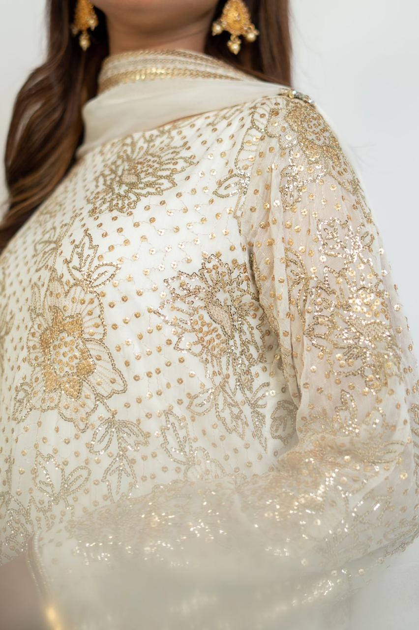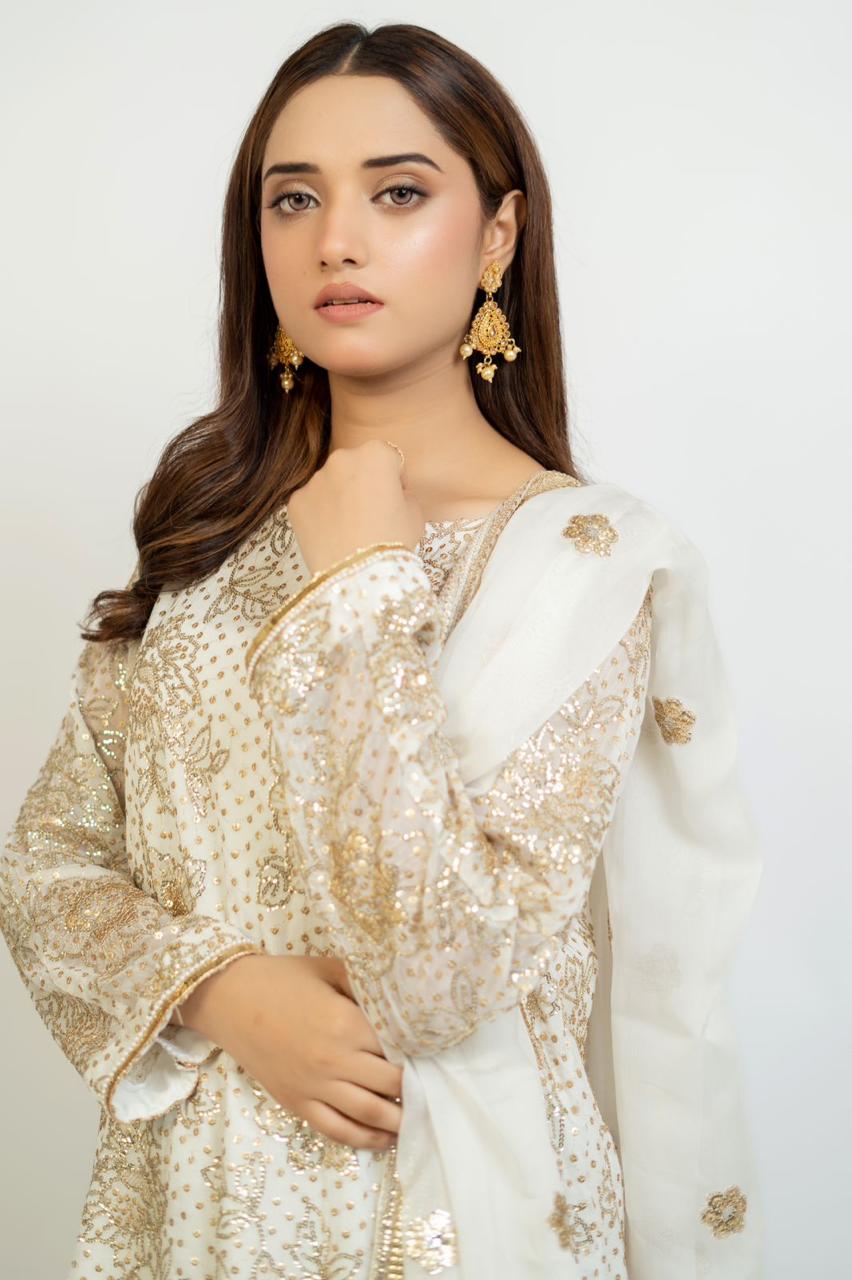 Fabric: Fully Sequine Chiffon Pure white Embroidered Front Back sleeves