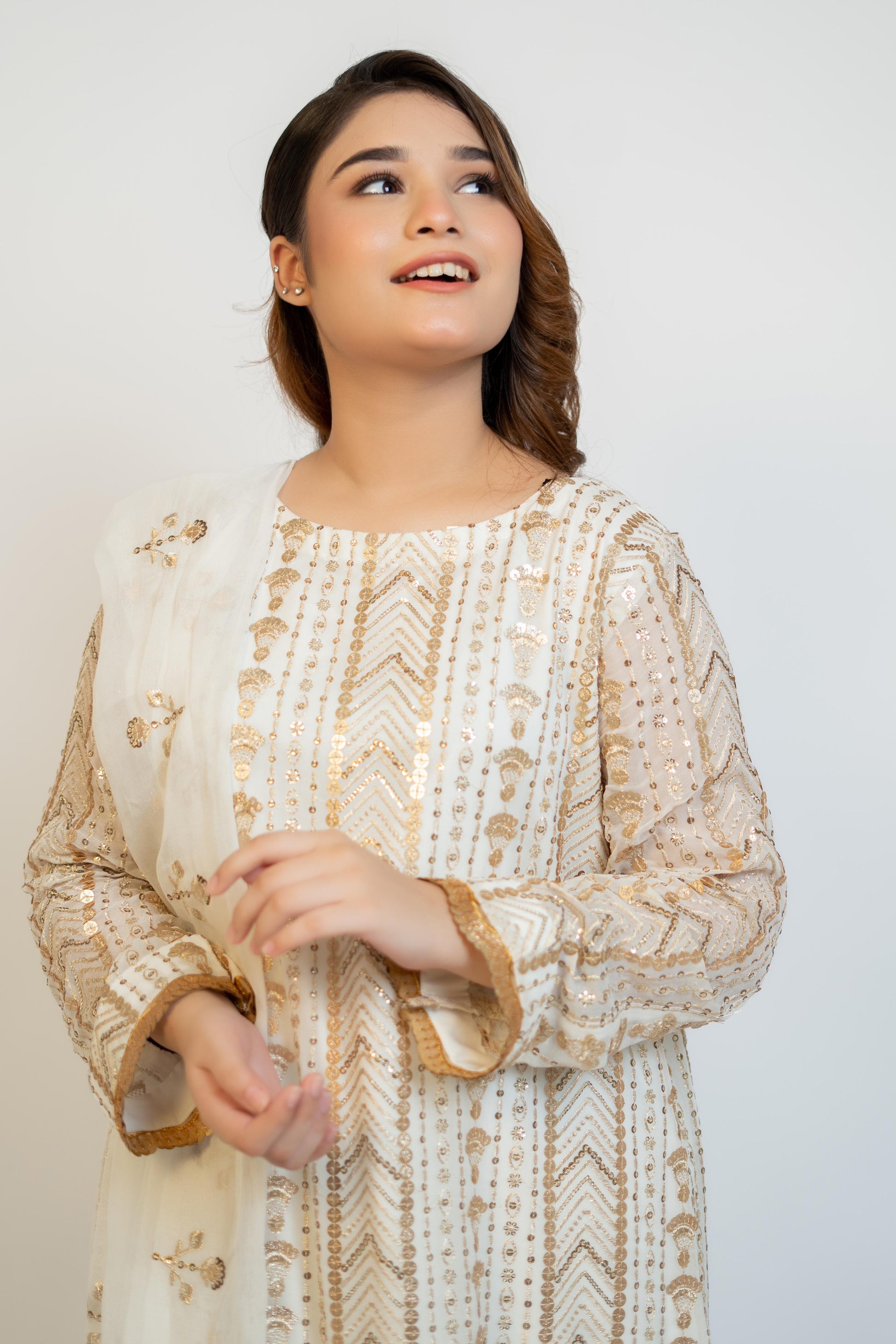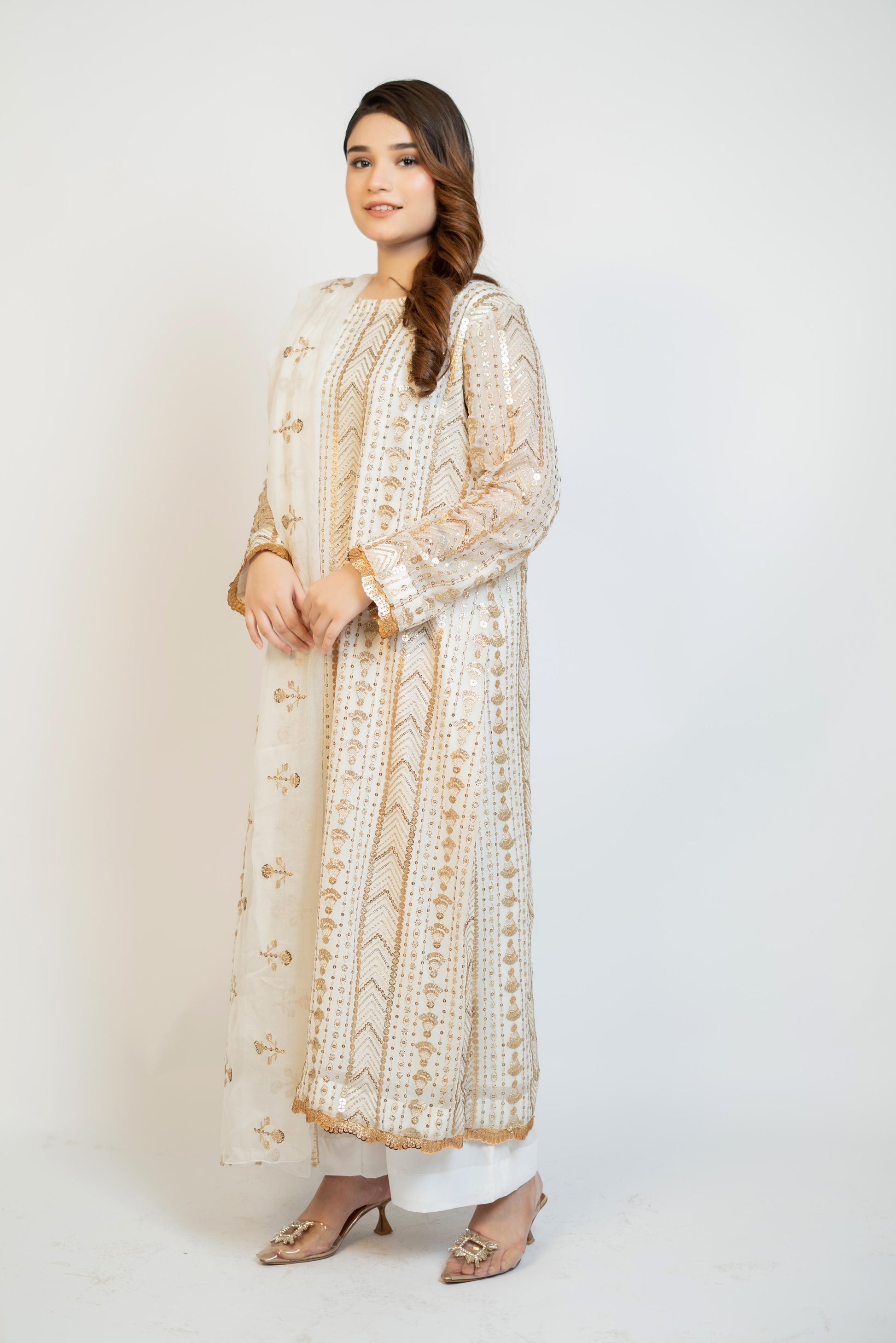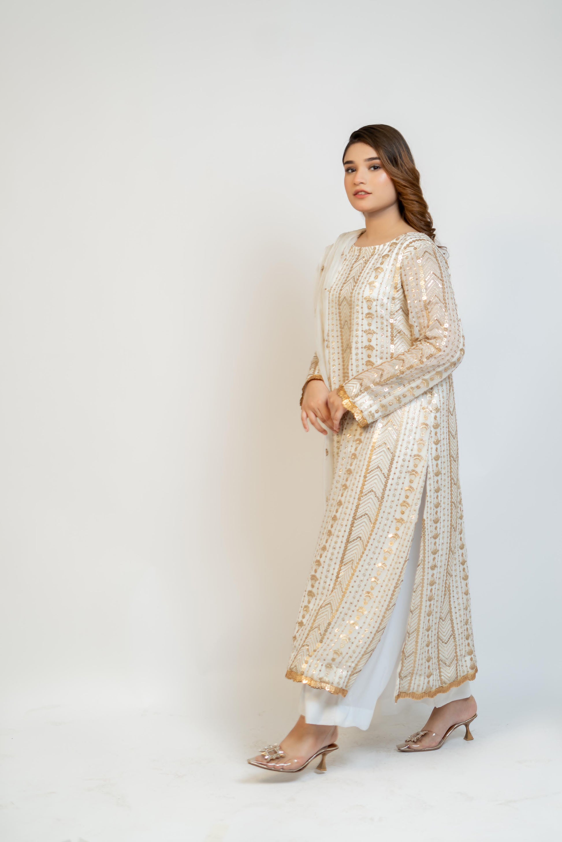MH 04 is a high-quality garment made from fabric that has been fully sequined and embroidered on the front, back, and sleeves. The pure white color and chiffon fabric give it an elegant and sophisticated look. The use of crape silk adds a touch of luxury to this beautifully crafted piece.